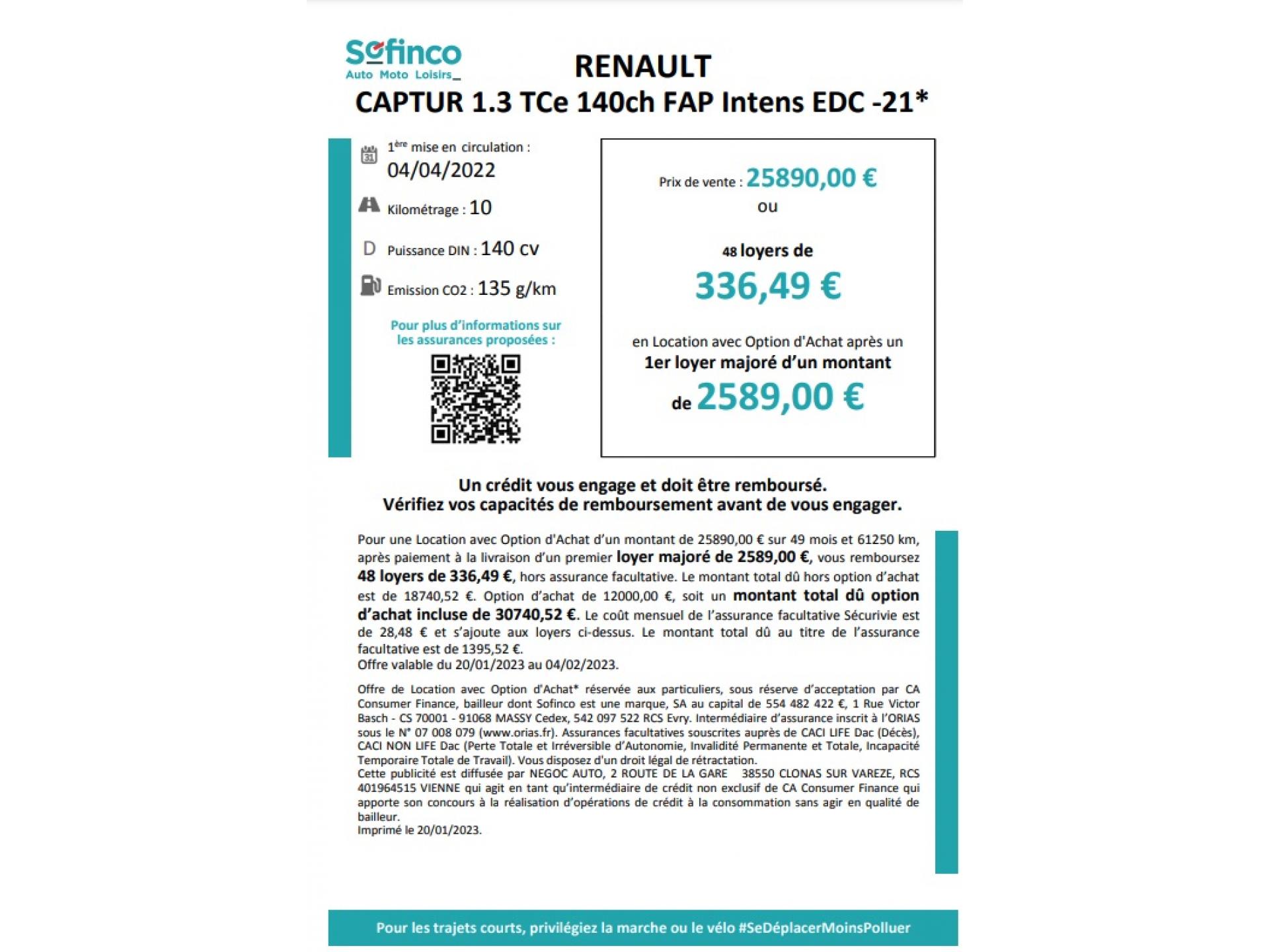 Nous vous proposons cette RENAULT CAPTUR au prix de 25 890 €, celle-ci a au compteur 10 km.