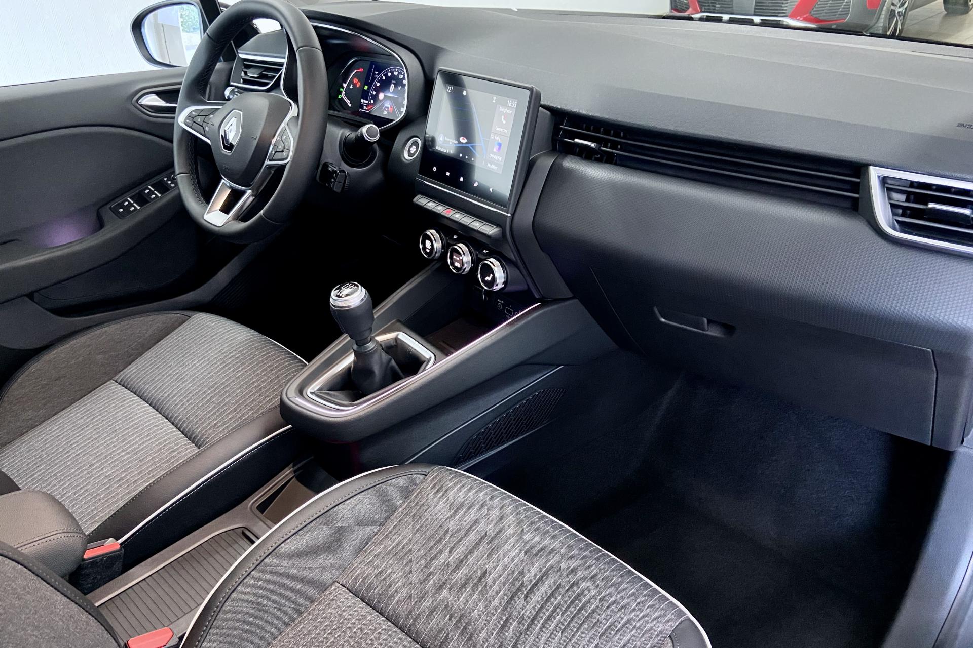 ABS avec aide au freinage d'urgenceAccoudoir avant, coulissantAide au démarrage en côteAirbags frontaux et latéraux, conducteur et passager avantAlerte de perte de pression des pneusAlerte de sortie de voie avec volant haptiqueAlerte de survitesse avec reconnaissance des panneaux de signalisationAlerte distance de sécuritéAllumage automatique des essuie-glacesAllumage automatique des projecteurs en fonction de la luminositéAssistance au maintien de voieBandeau supérieur des portes avant en matériau mousséBanquette arrière à dossiers rabattables, 60/40Boîte à gants ferméeCanule d'échappement chroméeCarte Renault « mains libres » (accès et démarrage)Ciel de Pavillon grisClimatisation automatiqueConsole centrale avant flottante, avec gainage en matériau softContrôle électronique de stabilité (ESC)Désactivation manuelle de l'airbag passagerEASY LINK 7” et navigationEclairage avant et arrière Full LED Pure Vision avec signature lumineuse en forme de « C »Eclairage d’ambiance : lumière personnalisable sur console centrale et accoudoir des portes avantFrein de parking électrique avec fonction Auto-HoldFreinage actif d’urgence, avec détection des voitures, motos, piétons, cyclistes (jour et nuit)Grille de calandre chroméeHarmonie intérieure noireIndicateur de changement de vitessesInserts en chrome satiné sur le volant et l’embase de levier de vitesseJantes alliage 16" Philia Diamantées GrisesJoncs chromés sur bandeau supérieur de calandreJoncs noir brillant sur protections inférieures de porteLécheur de vitres latérales chromeLève vitres électriques avant et arrière impulsionnelsLiseuses AV à LED Mode EcoPommeau de levier de vitesses en cuirProtections inférieures de porte avec signature CLIORégulateur et limiteur de vitesseRétroviseur intérieur électrochromatique (automatique jour/nuit)Renault MULTI-SENSE, personnalisation des modes de conduites et ambiance intérieures (3 mode pré-définis: MY SENSE, ECO, SPORT)Sellerie specifique noir / grise a rayures blanchesSièges confort, assise élargie et maintien latéral amélioréSystème Isofix aux places latérales arrière et passager avantTableau de bord avec écran numérique et personnalisable 7”Volant multifonctions réglable en hauteur et en profondeurVolant TEP